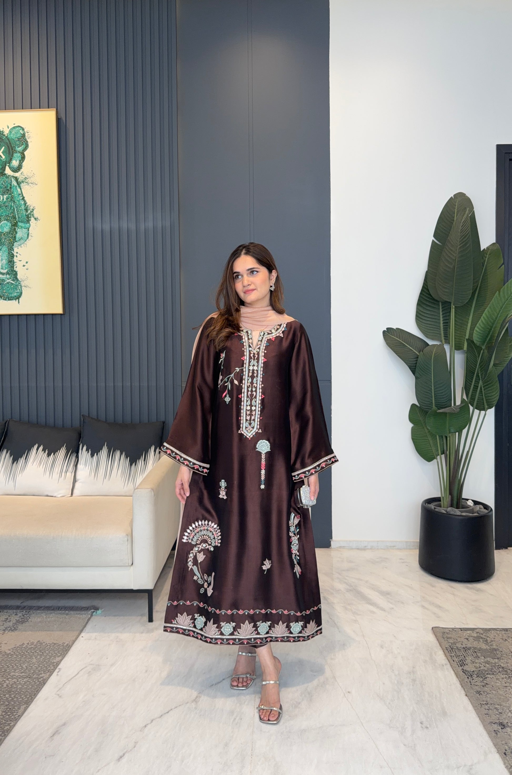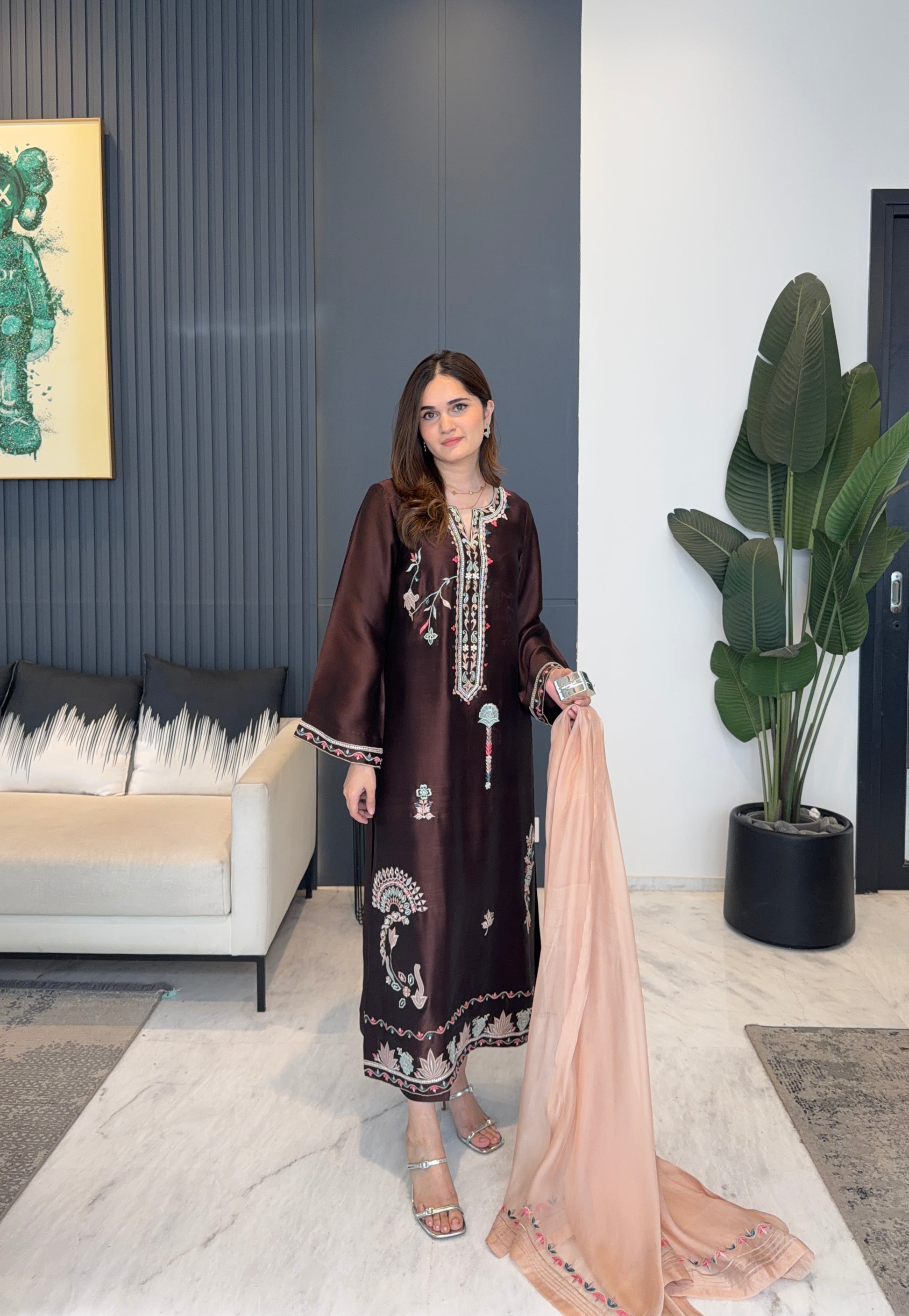 The shirt is adorned with delicate embroidery, intricate sheesha work, and refined hand embellishments paired with culottes.