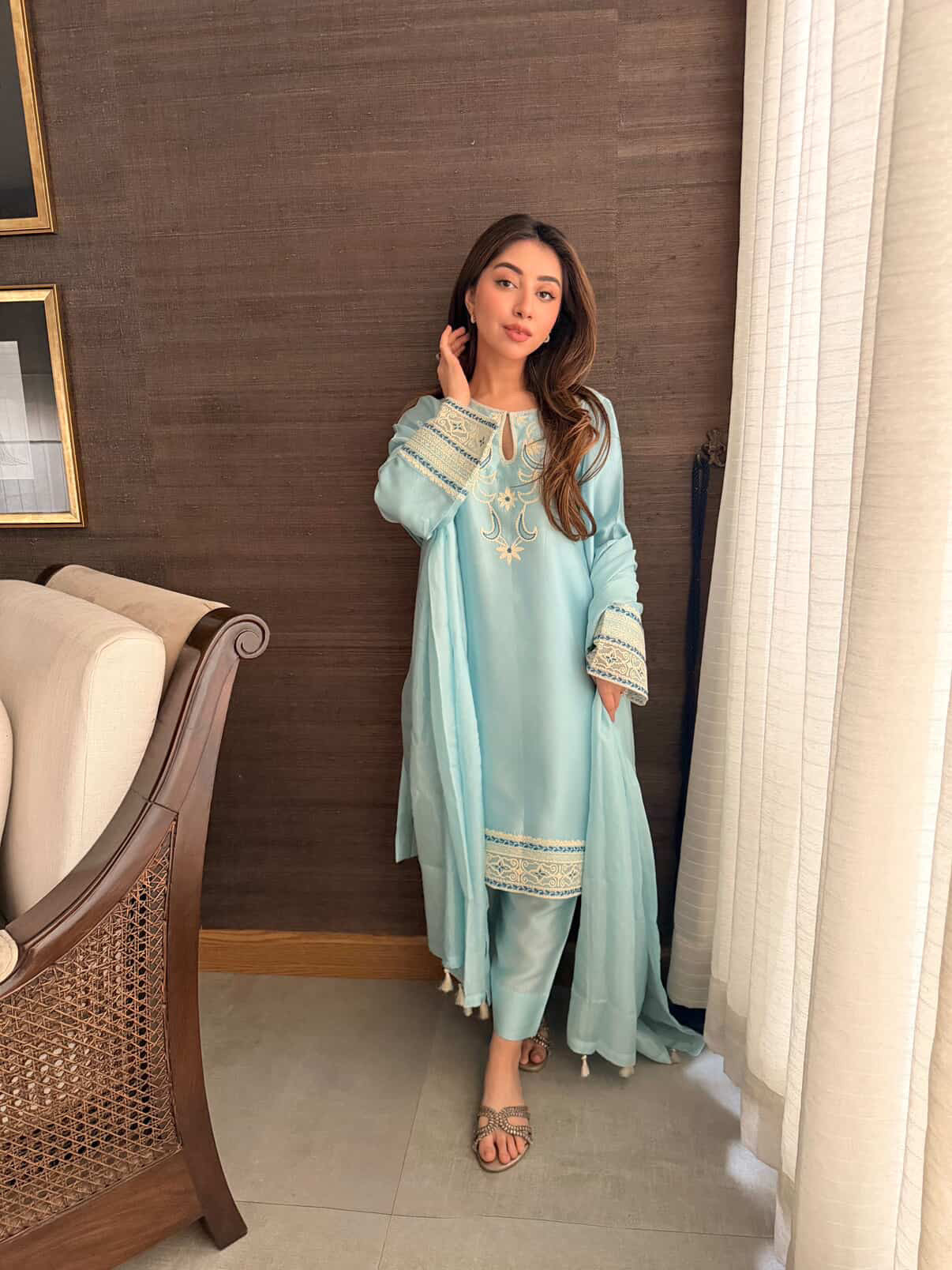 A soft seafoam outfit made from luxurious sheesha silk, designed for an elegant and comfortable look. The shirt features beautiful Aari embroidery on the neckline and sleeves, adding a graceful touch. It comes with matching sheesha silk pants and a lightweight medium silk dupatta that completes the look perfectly.